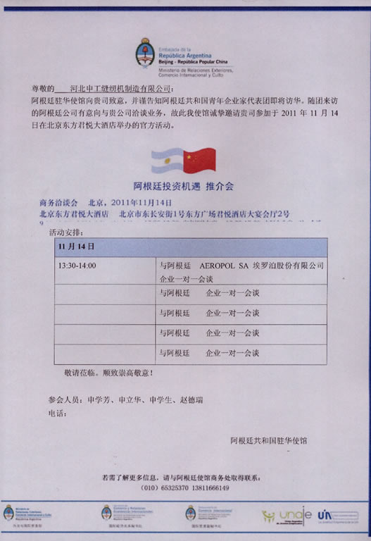 申工公司接受阿根廷驻中国大使馆的邀请,出席了11月14日在北京举办的官方活动。并与阿根廷共和国青年企业家代表团中的(AEROPOL SA )埃罗泊股份有限公司进行了一对一的会谈。