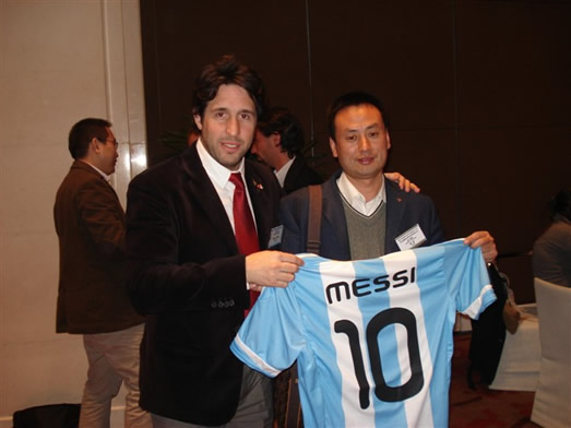 会谈后埃罗泊股份有限公司的总经理向我方赠送了阿根廷国家足球队著名球星梅西的10号球衣。